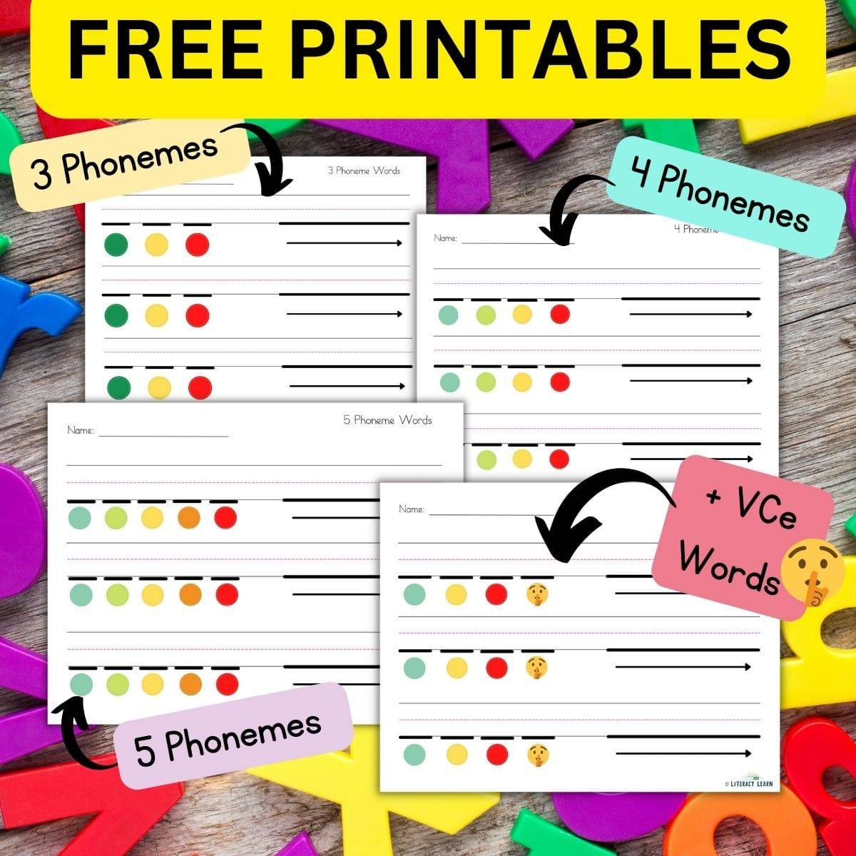 Get 4 FREE spelling worksheets sheets that are perfect for orthographic mapping. The best part is that they are reusable and easily adaptable for the phonics concepts youโre teaching! Use them to map words with 3, 4, and 5 phonemes, and use a special Silent E worksheet for teaching VCe words!